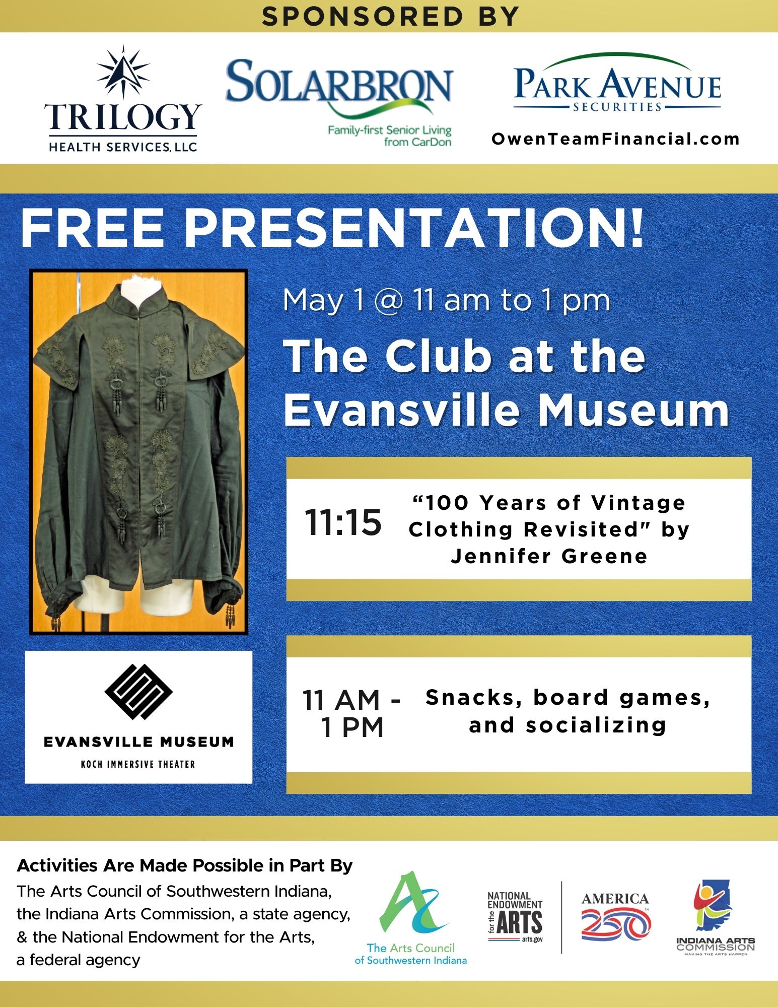 On Friday May 1 from 11:15 am to 1 pm, the Evansville Museum will be hosting its monthly Club. This FREE event, sponsored by Trilogy Health Services, Solarbron, and Park Avenue Securities & The Owen Team, is open to all adults and takes place from 11 am to 1 pm on the first Friday of (almost) every month.